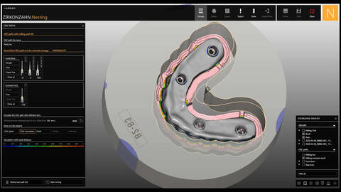 - Achsorientiertes Nestingprogramm mit ökonomischen materialoptimierten Strategien zur optimalen Positionierung von Zahnrestaurationsdateien im Materialblock